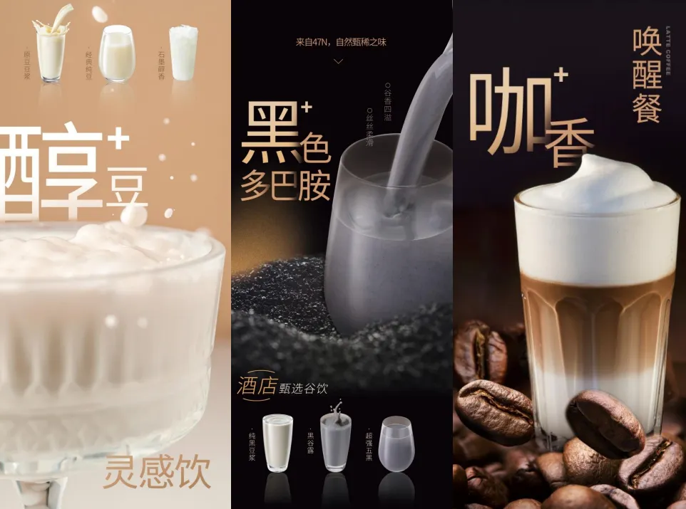 除了原料和工艺的优势外,九阳豆业还注重产品的创新和多样化。目前九阳豆业的产品已延伸至豆浆、豆花、谷饮、植物奶、果饮、乳饮、咖啡、汤羹等多个品类,口味方面也是选择多多,仅豆浆产品,就有燕麦薏仁豆浆、核桃花生豆浆、红枣桂圆豆浆等,可以满足消费者的多样化需求。酒店可以根据自己的需求选配适合自己的解决方案。黄欣透露,合作只是开始,九阳豆业的研发团队始终紧跟客群需求变化,持续创新出品,并不断向酒店输送。换句话说,酒店与九阳豆业的合作不是一成不变的,而是能根据消费市场的转变持续调整优化。这能让酒店在早餐模块始终与时俱进。