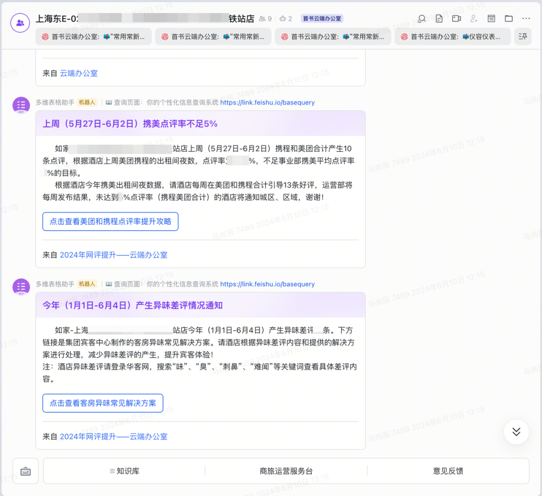 对于连锁酒店的管理来说,线上和线下的协同至关重要,面对跨区域、跨门店模型的布局,如家携手飞书打造了“云端办公室”,集合了所有门店的经营数据、销售执行数据、客户数据等,同时根据不同区域、品牌、模型,批量下发通知、公告及任务,确保信息直达相应酒店群,减少了信息传递的层级与误差。