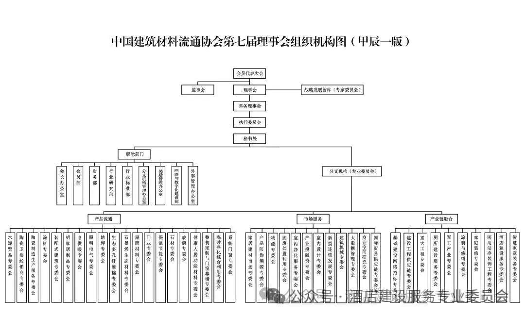本会秘书处设有会长办公室、会员部、财务部、行业研究部、行业标准部、分支机构管理办公室、行业奖励管理办公室、国际事务部、智库服务部9个职能部门。还设有三大板块分支机构,协同创新机构2个:产品流通检测委员会(筹)、大数据管理委员会;研究机构1个:商业研究委员会;另外还设有业务专业委员会40个,其中【产品流通类】:水泥贸易委员会、陶瓷卫浴经销商委员会、陶瓷制造生产服务委员会、电供暖委员会、照明电气委员会、地坪委员会、涂料委员会、铝家居制品委员会、生态多孔纤维棉委员会、屋面瓦委员会、装配式建筑委员会、涂装产业委员会、石墨烯生态材料委员会、保温节能委员会、门业委员会、石材委员会、防火玻璃委员会、健康人居功能材料委员会、智能门窗幕墙委员会、海砂淡化综合利用委员会,【市场服务类】:家居建材市场委员会、智能消费服务委员会、产品防伪溯源委员会、建设工程供应链委员会、物流委员会、文化建设委员会、展览服务委员会、固废处置委员会、室内净化服务委员会、软体装修贸易服务委员会、公共应急事务委员会、重大工程委员会、产业集群规划委员会、室内设计委员会,【产业链融合类】:基础建设网络招标委员会、雄安开发委员会、军民融合委员会、厕所建设服务委员会、家庭装修委员会、酒店建设服务专业委员会、医用洁净装饰工程委员会,还有正在筹备的铜材交易委员会、国际贸易供应链委员会、新型连锁发展委员会等产业链上的多领域专业委员会。