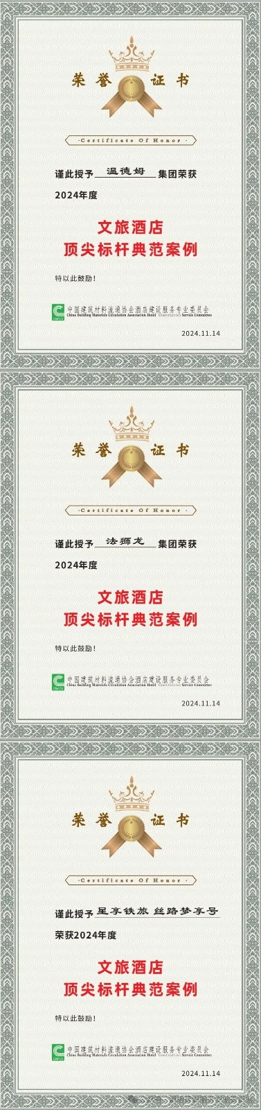 本次文旅酒店业主筹建论坛酒委特邀百位头部品牌及文旅业主董事长总裁,上市公司执行董事,集团首席发展官,更有知名企业家,人大代表政协委员和党支部书记云集体现中国企业家高水平风范及顶流资源整合能力和行业引领,并评选推荐出2024年度文旅酒店顶尖标杆典范案例,一经推出得到极大高度重视和强烈反响!分别是:THG九牧集团温德姆集团星享铁旅、丝路梦享号上海海鸥丽晶酒店、广州瑰丽酒店、陕西万众控股集团、海外海、法狮龙、深圳建筑设计研究总院、浙江大学建筑设计研究院、昆明花之城豪生国际大酒店、上海阿纳迪酒店。