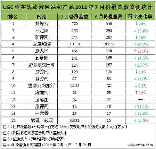 根据劲旅咨询-劲旅智库对UGC(全称为User Generated Content,即用户生成内容)型旅游" >在线旅游网站和产品监测结果显示,7月份主要UGC型在线旅游网站和产品用户覆盖数排名前十位的是:蚂蜂窝、一起游、驴评网、百度旅游、旅人网、到到网、游多多旅行网、穷游网、自游网、去哪儿网旅行。