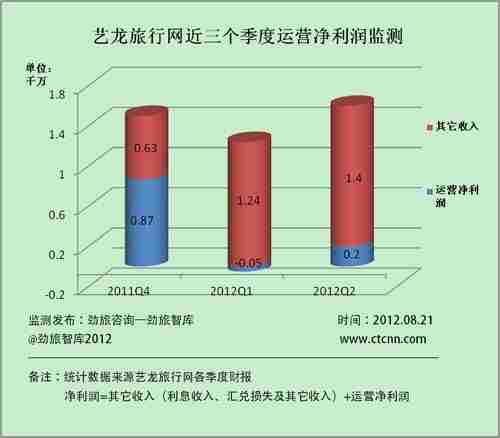 近日,艺龙旅行网刚刚发布了未经审计的2012年第二季度财报。财报数据显示,艺龙第二季度净利润1600万元人民币,其中,利息收入为1400万元人民币。如扣除利息收入,艺龙第二季度的运营净利润仅200万人民币,上个季度运营净利润还是负数,为负50万元。