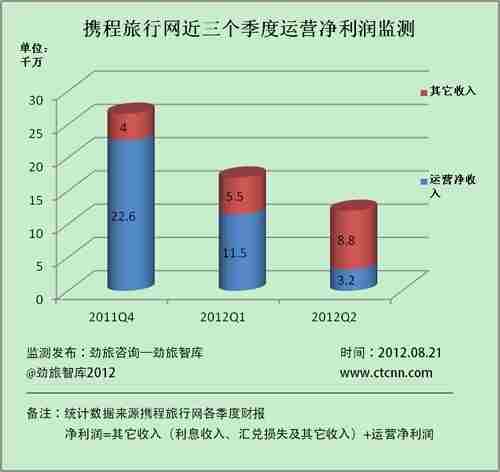 无独有偶,于7月25日公布2012年第二季度未审计财报的携程旅行网也存在同样的现象。根据财报显示,2012年第二季度归属于携程股东的净利润为1亿2000万元人民币,其中,归属于利息收入及其他收入部分约为8800万人民币,归属于携程Q2运营净利润的部分约为3200万人民币,与前几个季度环比降低很多。