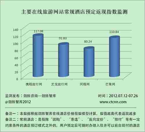 自开打价格战以来,各大在线旅行商就纷纷宣布投入重金来进行各种优惠促销活动。劲旅智库对携程、艺龙、同程网、芒果网等四家主要在线旅行商在七月份一段时间内可预订酒店的预定返现情况进行了统计。