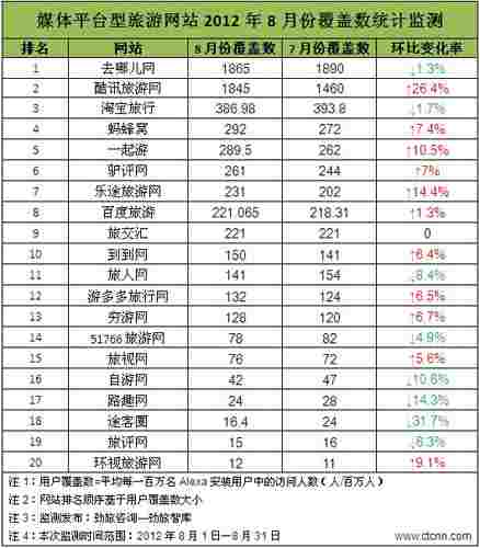 劲旅网讯,根据劲旅咨询-劲旅智库对Alexa最新数据统计结果显示,在2012年8月1日至8月31日一个月时间内,媒体平台型旅游网站" >旅游网站用户覆盖数排名前10位的网站分别是:去哪儿网、酷讯旅游网、淘宝旅行、蚂蜂窝、一起游、驴评网、乐途旅游网、百度旅游、旅交汇、到到网。