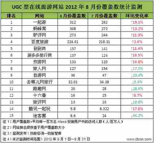 劲旅网讯,根据劲旅咨询-劲旅智库对UGC(全称为User Generated Content,即用户生成内容)型旅游" >在线旅游网站和产品监测结果显示,8月份主要UGC型在线旅游网站和产品用户覆盖数排名前十位的是:一起游、蚂蜂窝、驴评网、百度旅游、到到网、游多多旅行网、穷游网、旅人网、自游网以及去哪儿网旅行。