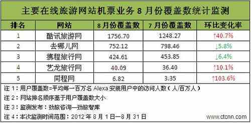 8月份主要在线旅游网站机票预定业务覆盖数监测