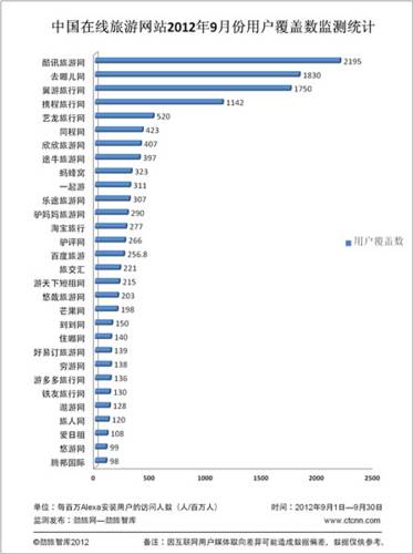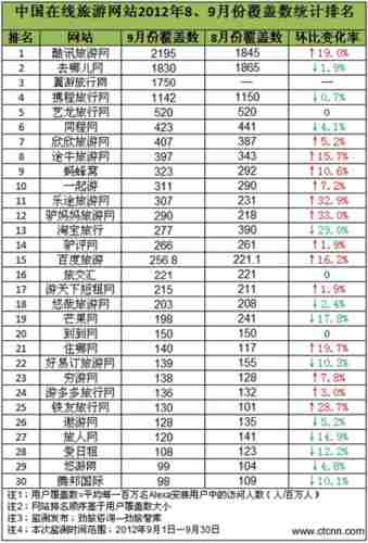 根据劲旅咨询-劲旅智库对Alexa最新数据的统计结果显示,在2012年9月1日至9月30日一个月时间内,中国旅游" >在线旅游网站用户覆盖数排名前10位的分别是:酷讯旅游网、去哪儿网、翼游旅行网、携程旅行网、艺龙旅行网、同程网、欣欣旅游网、途牛旅游网、蚂蜂窝、一起游。