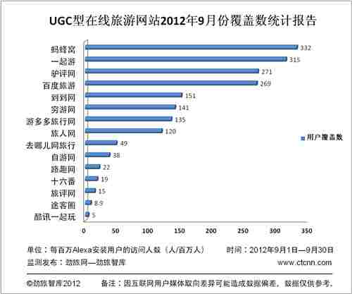 劲旅网讯,根据劲旅咨询-劲旅智库对UGC(全称为User Generated Content,即用户生成内容)型在线旅游网站和产品监测结果显示,9月份主要UGC型在线旅游网站和产品用户覆盖数排名前十位的是:蚂蜂窝、一起游、驴评网、百度旅游、到到网、穷游网、游多多旅行网、旅人网、去哪儿网旅行和自游网。
