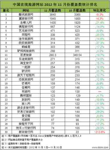 (图二:11月前30家中国在线旅游网站用户覆盖数及环比变化)