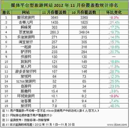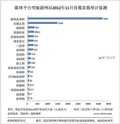 根据劲旅咨询-劲旅智库对Alexa最新数据统计结果显示,在2012年11月1日至11月30日一个月时间内,媒体平台型旅游网站用户覆盖数排名前10位的网站分别是:酷讯旅游网、去哪儿网、蚂蜂窝、百度旅游、乐途旅游网、淘宝旅行、一起游、驴评网、穷游网以及到到网。