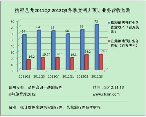 图二:携程艺龙2011Q2-2012Q3各季度酒店预订业务营收监测