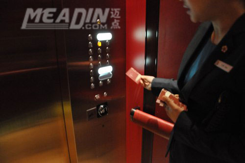 黄龙饭店:酒店是覆盖在RFID的系统下面的,当我们进入电梯之后,我们就可以体验客房智慧导航系统。我们需要刷一下含芯片的这个房卡,然后输入您的房号,一出电梯,系统会自动感应您的房卡信息,三道指示牌指引您直至自己的房间。