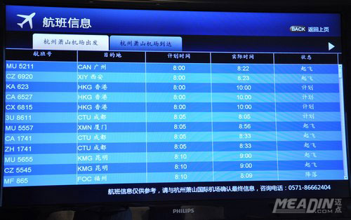 电视系统以萧山机场的出发、到达两方面展示信息。整个信息15分钟更新一次,并在下方有萧山机场的电话号码方便致电询问。客人住酒店不用担心航班延误或者因天气取消怎么办,只要打开电视查询航班状态即可,若航班延误就可多住一天酒店,不需要去机场苦苦等候。当然,15分钟更新一次信息,也可以让客人实时了解航班的延误状况。