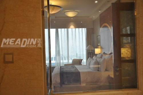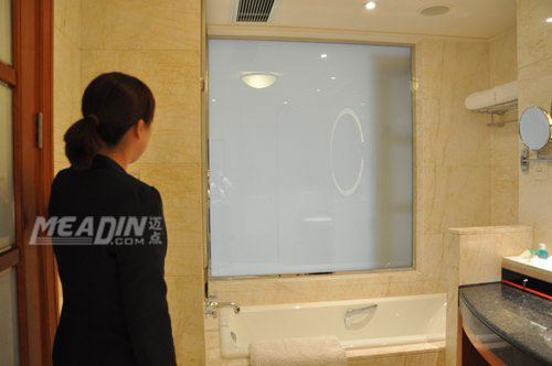 在沐浴之前拉帘子较为费时费力,只要一按开关即可得到“私密空间”,这就是黄龙饭店的“一键雾化玻璃”。