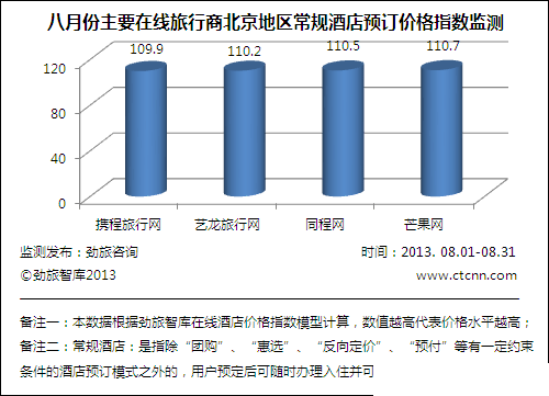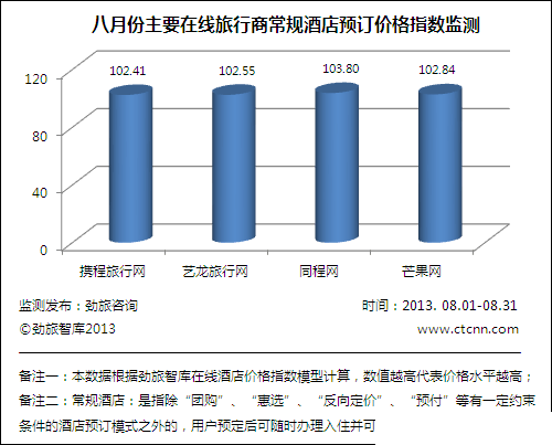 国内知名旅游行业研究咨询机构—劲旅咨询最新发布了《2013年8月份中国在线酒店价格监测分析报告》,对国内主要在线旅行商(OTA)酒店预订业务价格情况进行了深入跟踪调研。这是继《2012年7月份中国在线酒店价格监测分析报告》后连续发布的第十四份针对国内主要在线旅行商酒店预订业务价格监测的分析报告。