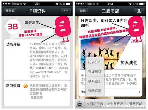 近日,三碧酒店官方微信华丽升级,实现了个性化的菜单定制,微信底部的对话栏处,增加了可供选择的“门店信息”、“会员优惠”、“最新活动”三个菜单选项的内容,这比起原先用户主动发起的对话式的交互有了新的突破。
