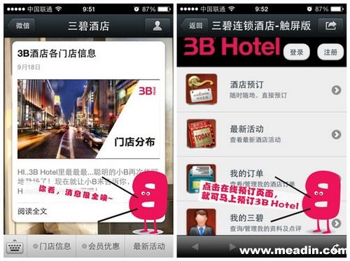 三碧酒店是国内首家大众时尚连锁酒店,门店所分布的区域集中在长江三角洲,为方便宾客查询酒店信息,特别加设了“门店分布”、“酒店官网”子菜单,同时,还增加了结合连结酒店手机官网栏,可就用户的差旅需求,直接在线预订三碧酒店,使预订变得更直面、更便捷。