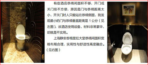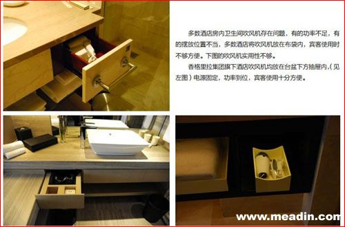 在调研过程中,我通过大量的细节对比,发现了目前高星级酒店普遍存在的现象,即:硬件投入一家比一家豪华,设计上越加新颖时尚,但注重“实用性、舒适性、专业性”的却不多。就酒店产品的功能性而言,均存在着适用性不够,个别产品甚至很不实用。下面我结合些案例与同行探讨: