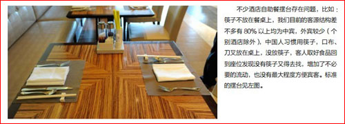 比如:酒店大堂公厕,有的酒店封闭式恭桶间仅2个,客房数却有300间套,在客情高峰时段很难满足宾客需求。还有多数酒店恭桶间面积不够,开门或关门极不方便,原因是门与恭桶距离太小,开关门时人只能站在恭桶侧面,我发现最小的门与恭桶垂直距离是1公分,该酒店使用设备、材料非常豪华,却就是不实用。又如客房台盆,有些酒店为了追求时尚、个性,选择很别致的异形台盆,价格昂贵,却不实用,有的台盆过浅,易溅水,有的容量过小,如果客人想在房内自己洗衣也极不方便,美观与时尚应该追求,但有个前提要满足实用性,酒店产品功能不是供宾客参观欣赏,而是让客人使用体验的,方便实用这是个基本原则,必须要遵循。不少酒店自助餐摆台存在问题,比如:筷子不放在餐桌上,我们目前的客源结构差不多有80%以上均为中宾,外宾较少(个别酒店除外),中国人习惯用筷子,口布、刀叉放在桌上,没放筷子,客人取好食品回到座位发现没有筷子又得去找,增加了不必要的流动,也没有最大程度方便宾客。诸如此类现象很多,虽然都是小问题,但都体现出酒店设计、建造、管理过程中的不足。
