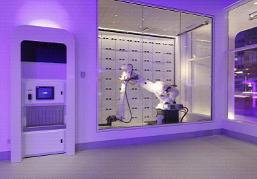 不管是手提电脑还是金银珠宝,机器人行李员都会为你放入专门的储物箱里,同时帮你看守储物箱。每天工作24小时,这让客人会十分放心自己物品的安全性问题。机器人低调地背对着旁人,一言不发地挥舞着长达3米的机械手臂,灵活地在玻璃隔断的行李间里的117个储物柜之间移动。