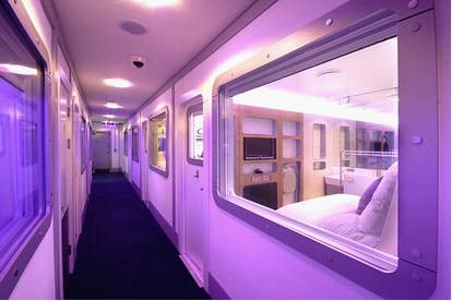 酒店的客房都挂满了紫色情绪照明灯,还配有几乎无声的加热和冷却系统,一面装有平面液晶电视的电子墙,各类型笔记本电脑和其他设备的电源插座,高速无线网络,一个通过电视机扬声器播放iPod和MP3音乐的连接设备以及一张通过按按钮可以扩展到全尺寸的电动床。