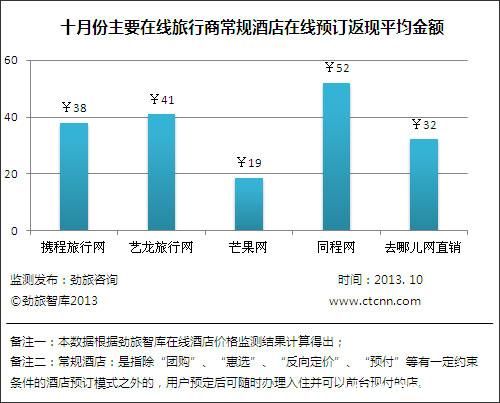 2013年10月份中国在线酒店价格监测显示,去哪儿网直销的在线酒店价格与四家OTA并无太大差别,仅略高于其他几家OTA;而在返现层面,去哪儿网的返现力度要低于携程旅行网、艺龙旅行网和同程网,其中,同程网返现均值最高,为52元,去哪儿网的返现平均金额仅为32元,而携程、艺龙的返现均值均多于去哪儿网。根据监测显示,在携程、艺龙都能同时监测到的300家酒店样本中,在去哪儿网上能查到的直销酒店数量约占到64%,即192家。在去哪儿网没有直销产品的108家酒店中,高星级酒店比例较大,超过60%,可知去哪儿网的直销目前还是以中低星级酒店为主,平均佣金更高的高星级的酒店直销力度还比较弱。