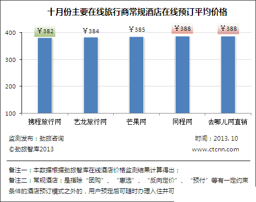 图二:五家主要在线旅游网站在线酒店预订均价(2013年10月监测)