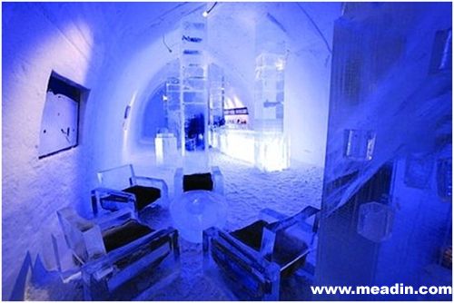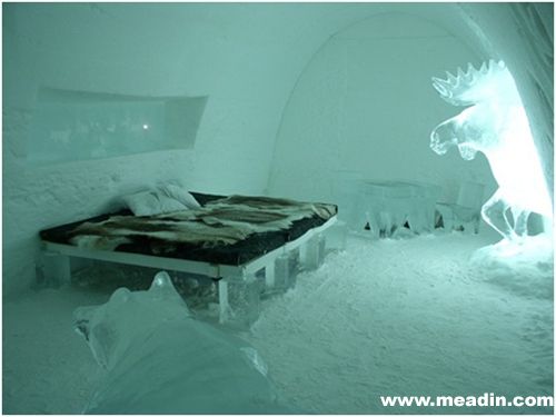 加拿大魁北克“冰酒店”是北美唯一的冰酒店,每一个房间风格不同,唯一相同的就是所有物品都是用冰块做成的。这里一应俱全床,桌子,椅子床头等。为了保持住客的温暖床上都铺有鹿皮。旅馆内雕刻有华丽的装饰以及家具,向游客打造出一个适合冰雪皇后居住的冬季仙境。