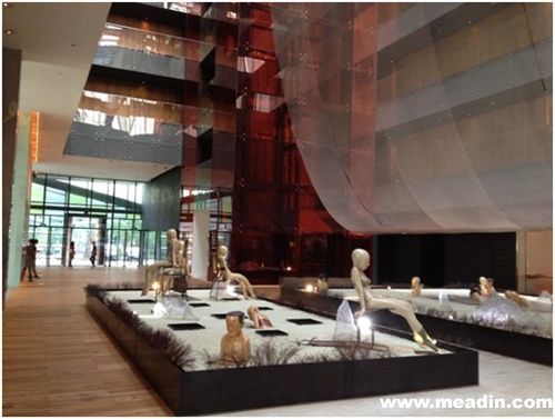 酒店的大堂的墙由中医小药柜组成的,小药柜可以打开。大堂中间是中国当代艺术风格鲜明的红色雕塑,雕塑为红色男孩,情态各异,耐人寻味。整个大堂的装饰风格简约富有当代气息,客人进了酒店就像进了798艺术区。
