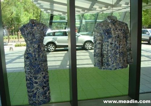 酒店靠墙的部分放着由青花瓷片做成的青花瓷旗袍和中式上衣,体现了中国元素。