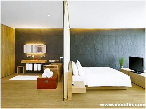 酒店客房的设计极尽简洁,橡木制深浸浴缸、概念雨洒式淋浴和发热式地板。酒店地下餐饮休闲区以“金木水火土”的五行概念,打造五个区域配合的不同质感。