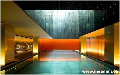 酒店游泳池也是酒店的设计亮点,光线是这座游泳池的设计要素,设计师在设计时特别选用了不锈钢的材质,不锈钢能够反射自然光线和光纤灯光,使整座泳池显得更为璀璨。当你置身其中,光与影在水波中交汇、反射,人就好像在黑暗与光明的界限中游走,给客户带去别样的体验。