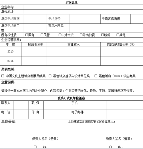 3、首届中国文化主题饭店论坛暨《文化主题饭店经营服务规范》国家行业标准贯标大会奖项申请表
