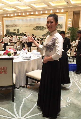 服务人员的衣裙也是量身制作,长袖立领旗袍,上身印有雷峰塔和三潭映月景色,下身是流畅雪纺长裙,飘逸脱俗,非常具有中国特色。本就清丽的黄雅晴穿上之后,更加亭亭玉立,温婉大方,气质如兰。