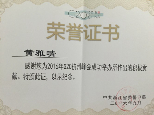 G20晚宴服务对于黄雅晴来说是一个美好的经历,这份辛苦和付出换来的是服务的荣耀,当真正进入角色之时,平时工作的积累就能自然地融入服务中。此次的接待任务对她来说是一次完美的提升和自我展现。让我们为她鼓掌,为她骄傲!