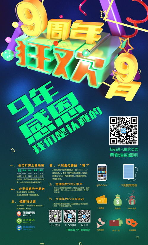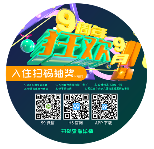 99旅馆携手姊妹品牌99优选酒店开启9周年狂欢盛典,为答谢9年来对99旅馆不断支持的客户,推出5项特惠活动及丰厚礼品,让客户劲享9月。