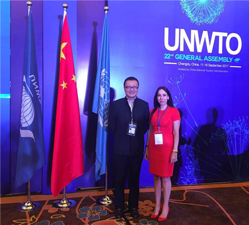 图为:先之教育创始人乔毅和UNWTO国际联盟事务部主任Yolanda Perdomo在大会现场合影