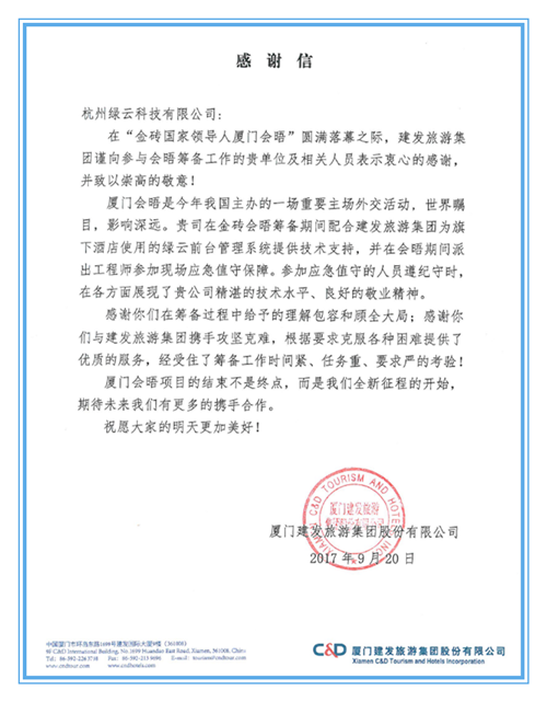 10月16日,绿云运维中心总经理丁广平收到由厦门建发旅游集团发出的感谢信,对绿云协助建发旅游集团筹备“金砖国家领导人厦门会晤”表示衷心的感谢和诚挚敬意。虽然这封感谢信时间落款距离今天已近一个月的时间,回顾会晤保障期间的日日夜夜,绿云人内心仍是满满的兴奋和骄傲。