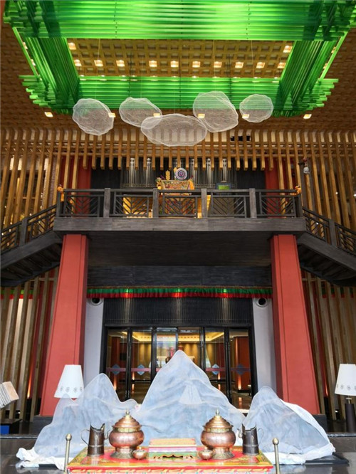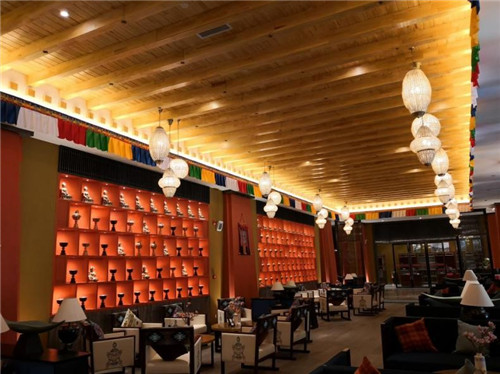 整个酒店采用藏式与现代相结合的风格装饰,唐卡、哈达、转经筒、酥油灯等藏式元素随处可见,同时加入了现代元素的修饰。