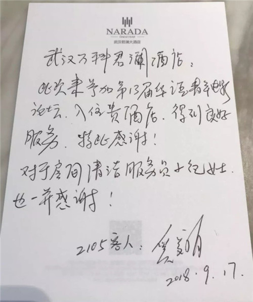 酒店雅致的环境、热情的员工与贴心的服务获得了到访嘉宾与主办单位的一致好评。本届年度新锐影人推选委员会主席(中国文联副主席、中国电影家协会副主席)奚美娟女士还专门为酒店亲笔写下感谢信。