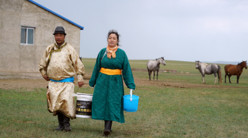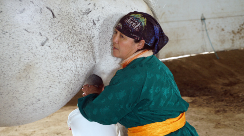 图雅夫妇每天都要去马房挤马奶,这是酿马奶酒的第一个步骤。然而这个看起来简单的过程并不那么容易,他们要想方设法让马放松,站姿稳定,才能顺利挤出马奶。放凉以后再搅拌,搁置进行发酵。马奶酒的酒精含量只有1.5到3度,是流行整个草原地区的传统饮料,配上各种奶食,也是款待来宾的佳品。按照草原的仪式,我们在喝之前也用手蘸了几滴,用手指弹向空中。