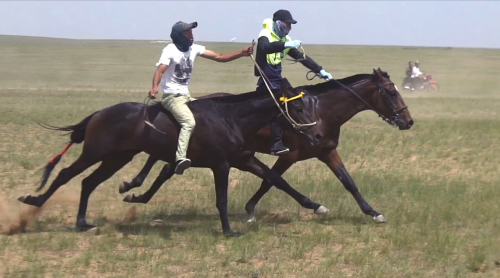 江的骑手新巴雅尔非常有经验,之前一直压着速度,在最后关头超越了第二名。马队前几名返回时扬起很大的烟尘,基本看不清人,在尘埃中努力辨认出第一名骑手,正是新巴雅尔,和老江的赛马“大枣”!