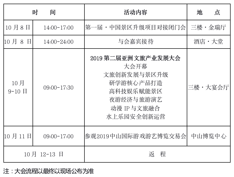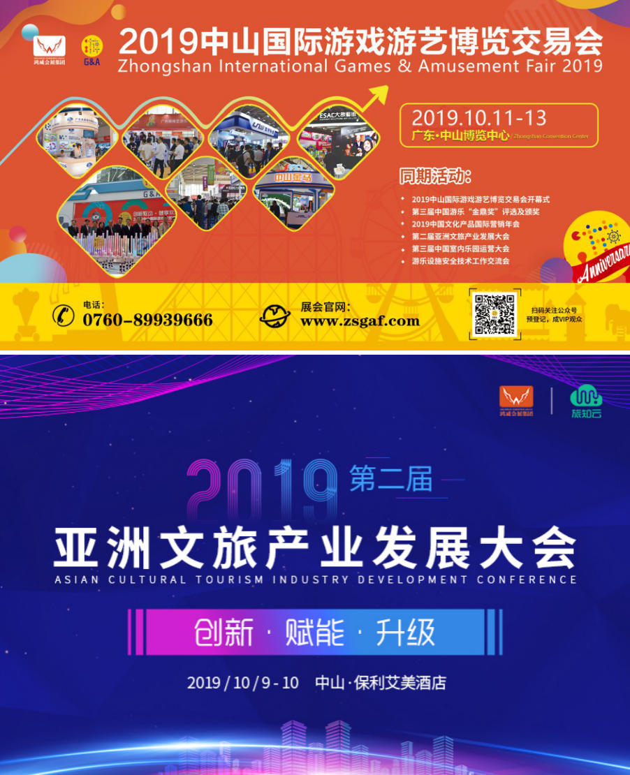 同期,10月9-10日,游博会配套大会“2019第二届亚洲文旅产业发展大会”将在中山·保利艾美酒店隆重举行,大会以“创新、赋能、升级”为主题,围绕文旅项目转型与创新、乐园景区升级、高科技娱乐、动漫IP与文旅融合、景区夜游经济发展、水上乐园创新发展以及乡村游、研学游创新发展等热门议题展开,汇聚福建省文旅厅、安顺市文化广电旅游局、中国旅游设计院、深圳华侨城、横店影视城、吉利控股、景域驴妈妈集团等知名文旅单位代表,共研2019亚洲文旅产业升级新趋势!