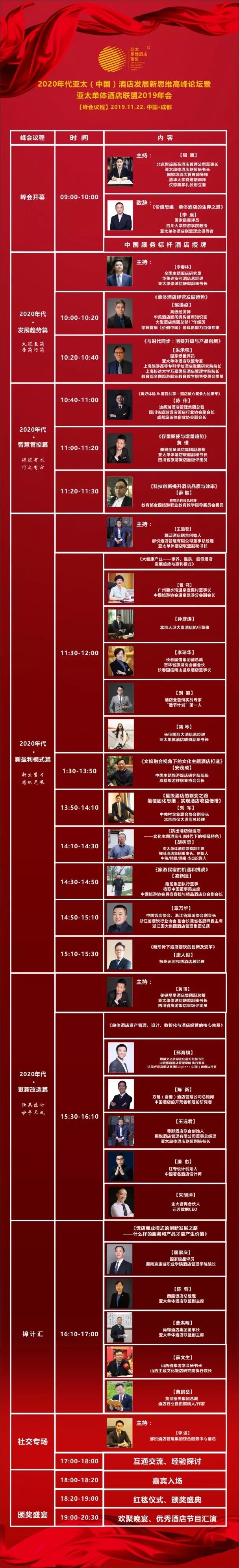 是业内最具权威性的实战派、落地型、数据化盛会,以"知事势,做当下,赢未来"为主题,以“分享·落地·为我所用”为主旨,设置2020年代“酒店发展趋势篇”、“酒店新盈利模式篇”、“酒店智慧管控篇”、“酒店更新改造篇”等精彩篇章,创设“路演·《最美奋斗者》”、“问答·专家一对一赋能指导”等实操课目及“颁奖盛典”。