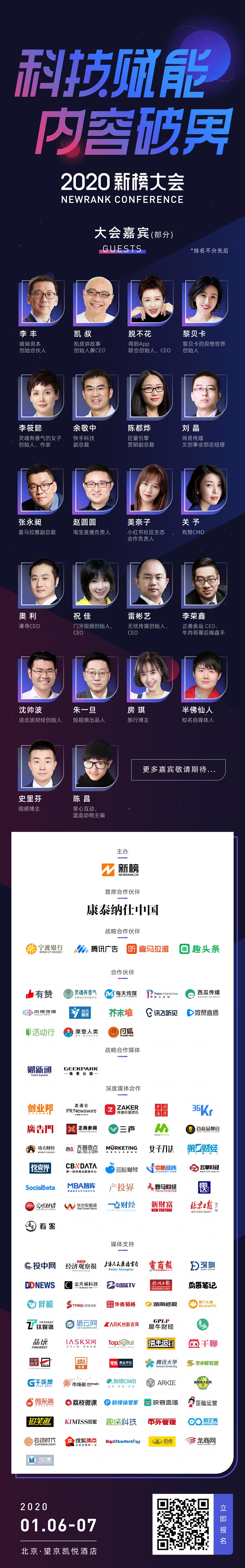 新媒体革命改变了我们的日常生活,但在商业社会,创作者、平台方、企业商家必须找到三方都能接受的合作方式,才能实现产业的繁荣。传统媒体时代,受制于纸质媒介的局限性,广告和销售是分离的。但在新媒体时代,“边看边买”具备了现实的可行性。“被浪费的那一半广告费”正在被压缩空间,企业更青睐的品效合一成为营销的必然趋势。从这个角度来讲,直播电商、短视频电商的出现实属必然。在过去这十年里,前半程我们中的大多数人都是旁观者,是吃瓜群众,是大V无数粉丝中的一个。但在后半程,这篇文章的读者,可能已经深度参与其中。从2014到2019的过去五年间,作为新媒体领域具备广泛影响的产业服务平台,新榜见证着这个行业的起飞与剧变。每年一度的新榜大会早已不是一家公司的年末总结,而是一个颇具影响力的内容产业盛会。大会必有大咖,新榜大会从不让人失望。往届峰会中包含了内容行业中的一线行业领袖、深度思考者和当红创业者。大会也必有大众的倾情参与,每一年的新榜大会总是座无虚席。2020年,新榜大会大幕已经拉开。站在行业的最前沿,大咖云集,解读未来趋势,你有望听到最有价值的行家分享。作为新榜大会核心竞争力的嘉宾阵容,正在陆续敲定。今年,你将看到凯叔讲故事创始人兼CEO凯叔、峰瑞资本创始合伙人李丰、快手科技副总裁余敬中、巨量引擎营销副总裁陈都烨、淘宝直播负责人赵圆圆、正善牛肉哥操盘手李荣鑫、朴实无华且枯燥的朱一旦等。名单将继续扩容中,你将有机在现场看到慕名已久的网红、创业者和行业领袖!