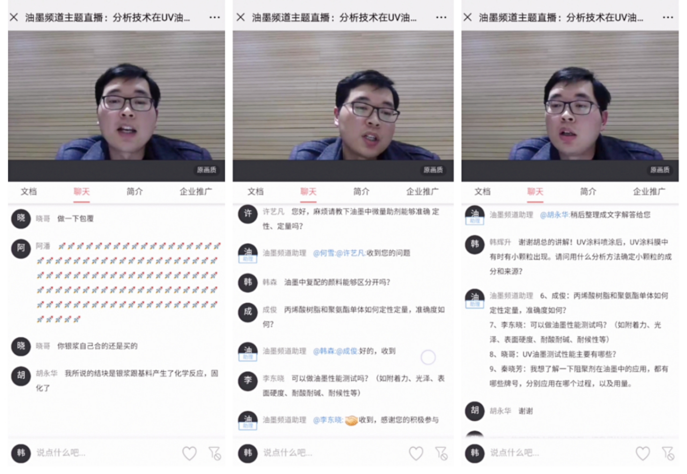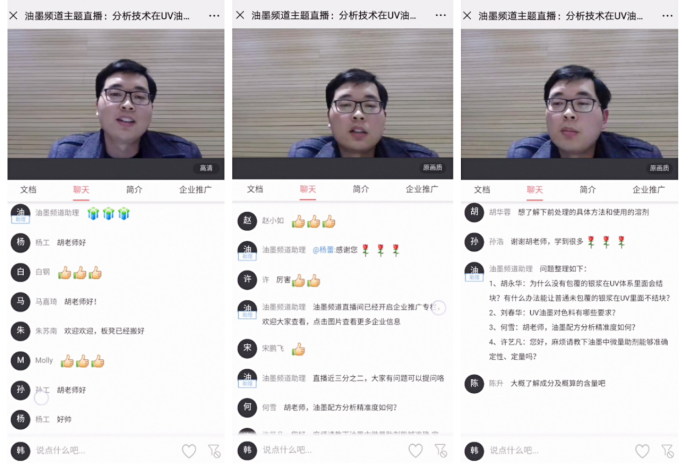胡工讲起课来,可谓魅力四射!聊天区各类礼物比比皆是,并纷纷向胡工的细致讲解表示感谢,更有观众直接问道“能不能建个微信交流群,把我们拉进去学习交流”,可见观众们的热情也是非常给力!据统计,本次油墨直播共收到观众发来的20余种问题,胡工在结尾环节选取部分问题进行解惑。(直播中所有问答,将在【油墨产业网】微信公众号中发布)