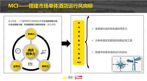 据介绍,迈点酒店竞争力指数MCI通过监测单体酒店在互联网和移动互联网的用户点评、运营、媒体数据综合计算,创造性的在Interbrand品牌价值评估法的基础上构建了MCI算法公式,通过MI(Media Index媒体指数)、OI(Operation Index运营指数)、CI(Comment Index点评指数)等将繁杂的数据表象通过精炼的客观指数呈现。累计覆盖50余城市,展现1万多家酒店和超过40种细分特色酒店类型,并引入品牌中国战略规划院作为强有力的学术后盾,目前已经和50家行业协会战略合作,并且得到100个集团品牌推荐使用和超过10万家单体酒店应用测试。