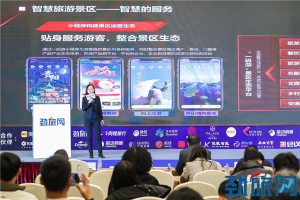 在主题演讲环节,易宝支付合伙人、副总裁韩琪;旅悦集团副总裁陈晓芸;中国联通集团文旅行业总监焦蕾秩;穿越千机创新科技集团景区业务总经理顾鹏及圣东旅居项目总监岳分别岩进行了主题演讲。