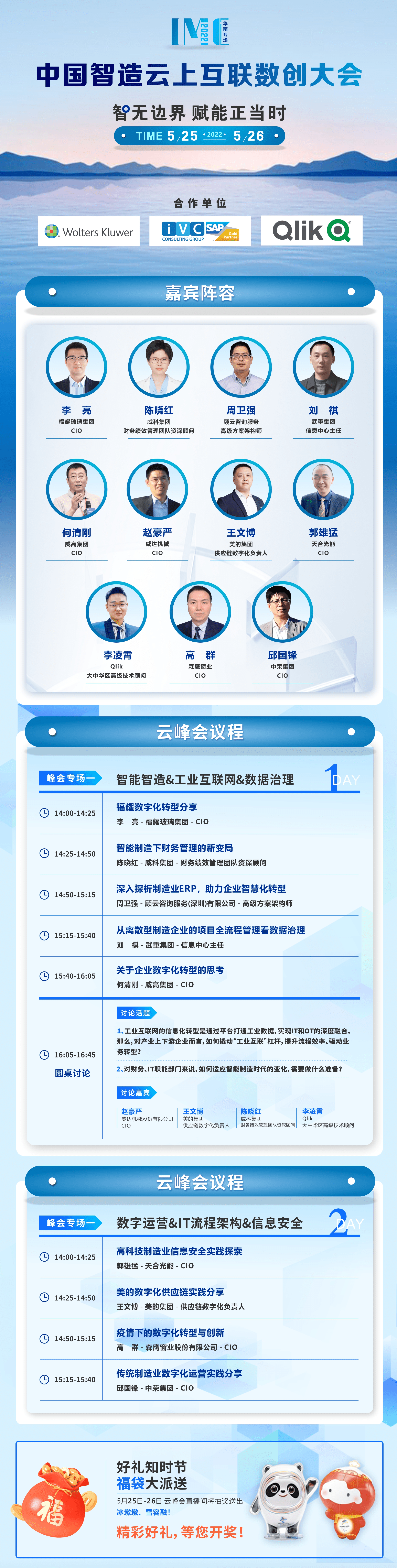 勤哲创世季之“IMC中国智造云上互联数创大会(华南专场)”将于2022年5月25-26日首发上线,此次云峰会以“智无边界 赋能正当时”为主题,会议邀请500+制造名企高管、数字化最高决策者、IT负责人及行业优秀信息化服务商,围绕工业自动化与数字化、工业互联网、数字化供应链与智能制造等多个热门技术及应用方向展开讨论,深入智能制造核心业务场景化痛点,汲取最新智能制造产业数字化科研成果,提前布局未来大市场!